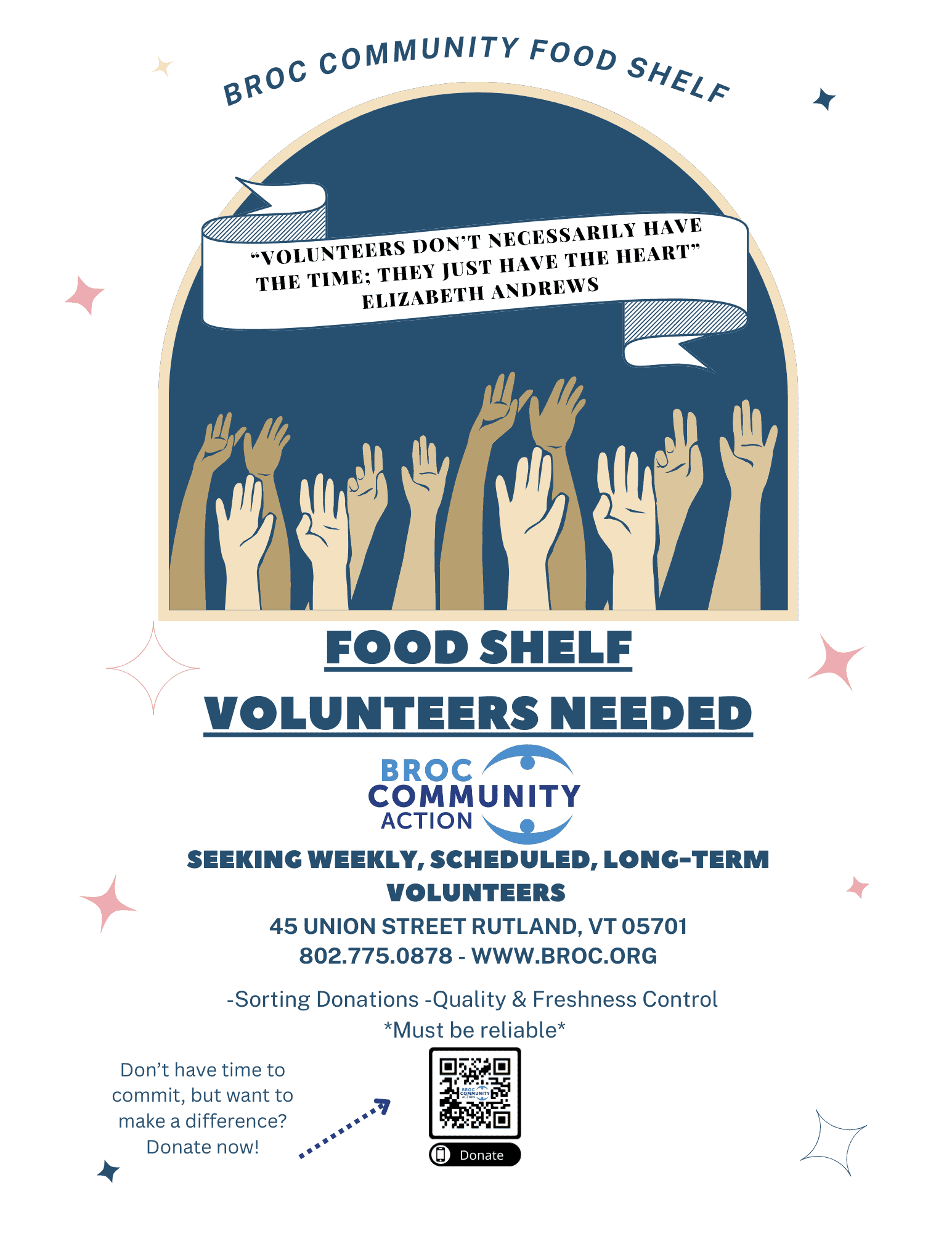 Volunteering at BROC Community Action Food Shelf is available in 2-hour time commitments, and you can choose how many times a month and what programs you would like to volunteer for. Please reach out for our Volunteer Application and email it back to [email protected]. To volunteer time, we do require that a background check is conducted.