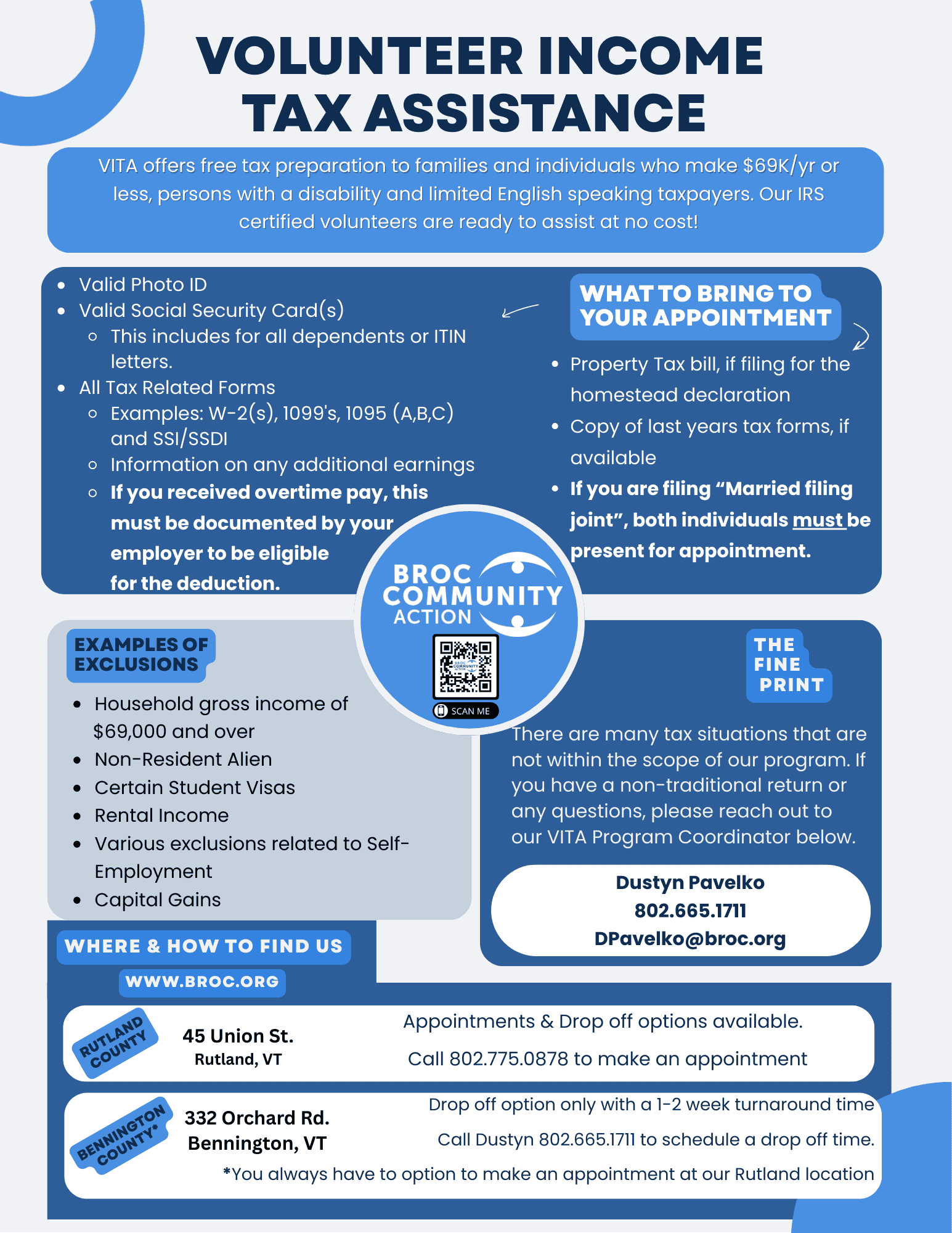 The Volunteer Income Tax Assistance (VITA) grant program is an IRS initiative designed to support free tax preparation service for the underserved through various partner organizations. This service helps low- to moderate-income individuals, persons with disabilities, the elderly, and limited English speakers file their taxes each year. IRS awards matching funds to these support organizations that offer free tax preparation services during the tax filing season at locations in all 50 states and the District of Columbia.